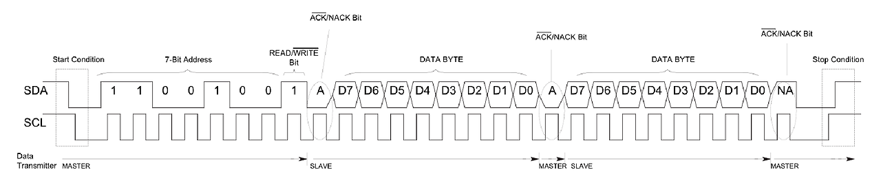 - 읽기 작업을 선택한 경우, 슬레이브는 요청된 데이터를 SDA 선으로 전송하고, 마스터는 각 데이터 바이트를 받은 후 ACK를 반환합니다.
